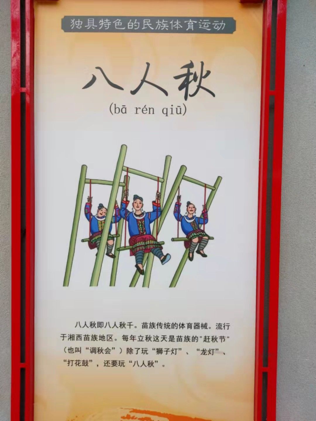 八人秋即八人秋千。苗族傳統的體育器械。流行于湘西苗族地區。每年立秋這天是苗族的“趕秋節”(也叫“調秋會”)除了玩“獅子燈”、“龍燈”“打花鼓”,還要玩“八人秋”。