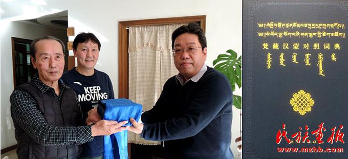 烏日根桑格(中)利用業余時間,與民族出版社蒙古文部原主任、資深編審卓日格圖先生(左一)合作出版《梵藏漢蒙對照詞典》。圖為向學者贈閱該詞典。
