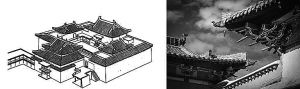 夏魯寺采用漢藏建筑風格結合制式(左),施以綠色琉璃瓦的漢式歇山頂及檐下斗拱(右)。閔天怡供圖