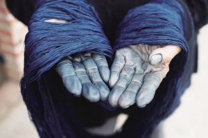 第一次在路上遇見黃邦芬奶奶,直覺就告訴我,她是我一直想找的人。一開始被她吸引,是看到提著一袋酸菜和一袋米豆的一只被染成藍色的手,視線再往上,果然,看到了一位穿著黑色藍靛土布大襟的老人。
