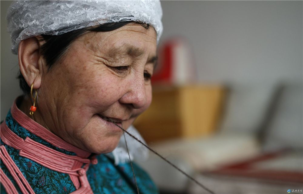 傳統(tǒng)氈繡不僅用于工藝品,大多用在生產(chǎn)生活中。蘇尼特氈繡技藝的繡制首先從制氈開始,大都在夏末秋初進(jìn)行。材料多為駝絨線,而紡駝絨線則是用駱駝膝蓋絨毛以及駝鬣的細(xì)絨手搓而成。