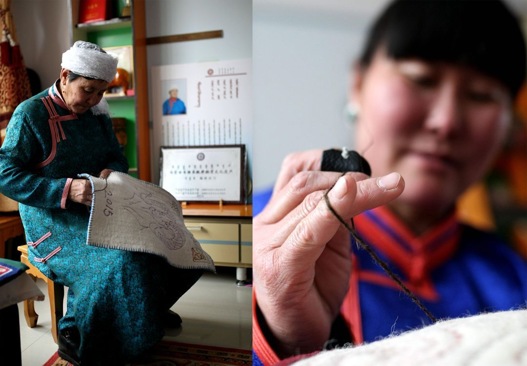 蒙古包穹頂?shù)絻?nèi)壁,從門簾到地上鋪的毛氈,從日常家居的蓋布到商旅使用的茶鹽袋,蒙古族人將細(xì)膩的各式花樣運(yùn)用在食衣住行的各個(gè)方面。而這些精美絕倫的裝飾都有一個(gè)共同的名字,那就是蒙古族氈繡技藝。