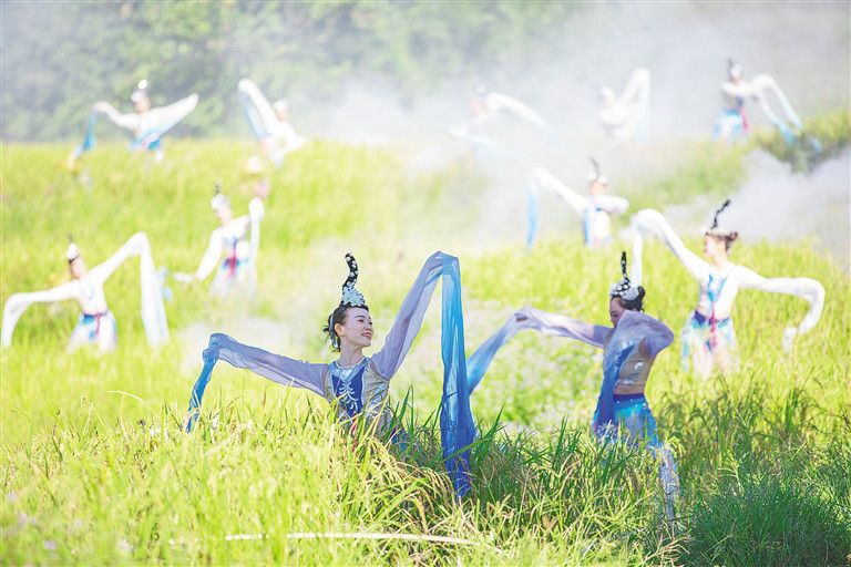 在枝繁葉茂的古榕樹樹蔭下,由當地德高望重的“奧雅”(黎語為老人)選吉時沿襲習俗,舉辦了祈福祭祀等儀式。隨后,通過稻田勞作歌舞實景演出的形式,陸續上演了《這片山》等節目,形象再現了黎族勞作、豐收的情景。緊接著,黎族器樂《慶豐收》、以及《歡樂的曬谷場》《山蘭糍粑甜又甜》《山蘭飄香等你來》等一系列民族歌舞節目輪番上演,讓遠道而來的賓客感受到了黎族民俗文化的獨特魅力。