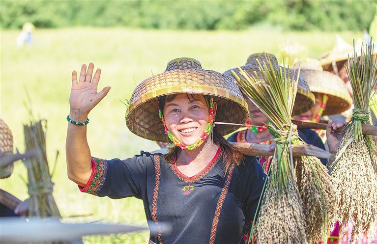 “砍山種植山蘭稻,一定要成功,煮好山蘭米,釀好山蘭酒,邀來親朋與好友,同慶好豐收……”當天,在位于霸王嶺下的青松鄉擁處村的山坡上,一串串飽滿的稻穗已壓彎了稻稈;此時,農戶們三五結伴爬上山坡,弓下腰身麻利地揮動著手中的鉤刀開割稻稈,在辛勤勞作之時,還不忘哼起黎族歌謠分享著又是一年山蘭好收成的喜悅。山坡上辛勤勞作的喜悅,與正在山腳下舉辦的“啦奧門”山蘭文化節的喜慶氛圍達成了同一節拍。