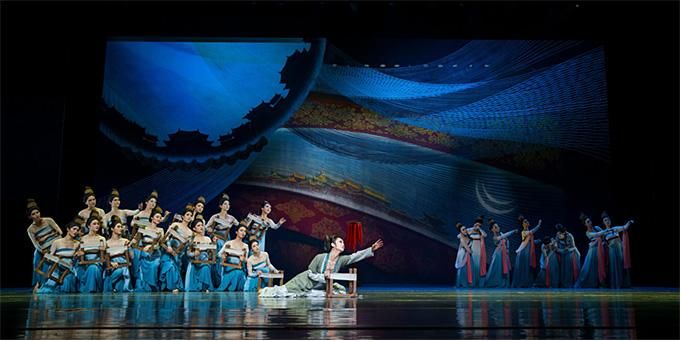 該劇在情感敘事和舞蹈語言上,采用“意中生象”“象中達意”的方式,從細微處融入唐代各地域各民族文化元素,凝練舞劇藝術品質:如取李白“醉入胡姬酒肆中”詩意演繹《胡姬舞》;取唐代畫家周昉《簪花仕女圖》畫意演繹《簪花舞》;取唐代畫家張萱《搗練圖》筆意演繹《搗練舞》;取王維“大漠孤煙直,長河落日圓”詩意生發《西涼武舞》等。在劇情發展和戲劇沖突中,設計符合人物性格的“獨、雙、三”主題舞段:凸顯西域風情的《胡旋舞》、表現曲江踏春的《采桑舞》和展示教坊舞技的《白纻舞》等情景舞段,展現了鮮明的民族文化交融特征,實現了中國傳統文化跨越時空的當代表達。