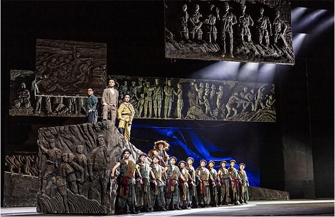 在舞蹈語言的設(shè)計上,編導(dǎo)融入當(dāng)代元素,使觀眾不但感受到審美的親切與現(xiàn)代感,而且還自然地進(jìn)入回望歷史的情境,對其思想內(nèi)涵的理解更為準(zhǔn)確。該劇的道具使用和調(diào)度也頗為大氣,令人印象深刻。一組斜坡狀的大型舞臺道具不但由群眾演員直接移動而實現(xiàn)即時的場景調(diào)度,還可使演員上下和左右而行,最終組合成巨大的中國共產(chǎn)黨黨徽,輔助完成了人民英靈和英雄的形象塑造。