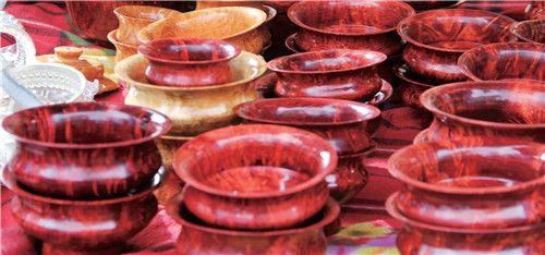 加查的木碗,還有一種是用雜木制成,具有防毒功能,非常名貴。這種木碗的選材非常講究,是用一種寄生的植物,藏語名為“吧”,做出來的木碗木質黝黑透亮,紋路非常細,若是配上銀飾,則可以十分明顯地預防毒藥,這在以前,可是日常生活和外出旅游的最理想餐具。