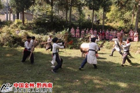 據普安縣志記載,“蒙灑”苗人是明末遷至普安,其“惹捱德亙”(蘆笙棒舞)起源于何時,均無文字可考,但從其傳說、表演形態和伴奏音樂看,苗族蘆笙棒舞是我國古代歌、舞、樂一體的藝術形態在苗族族群中的留存。