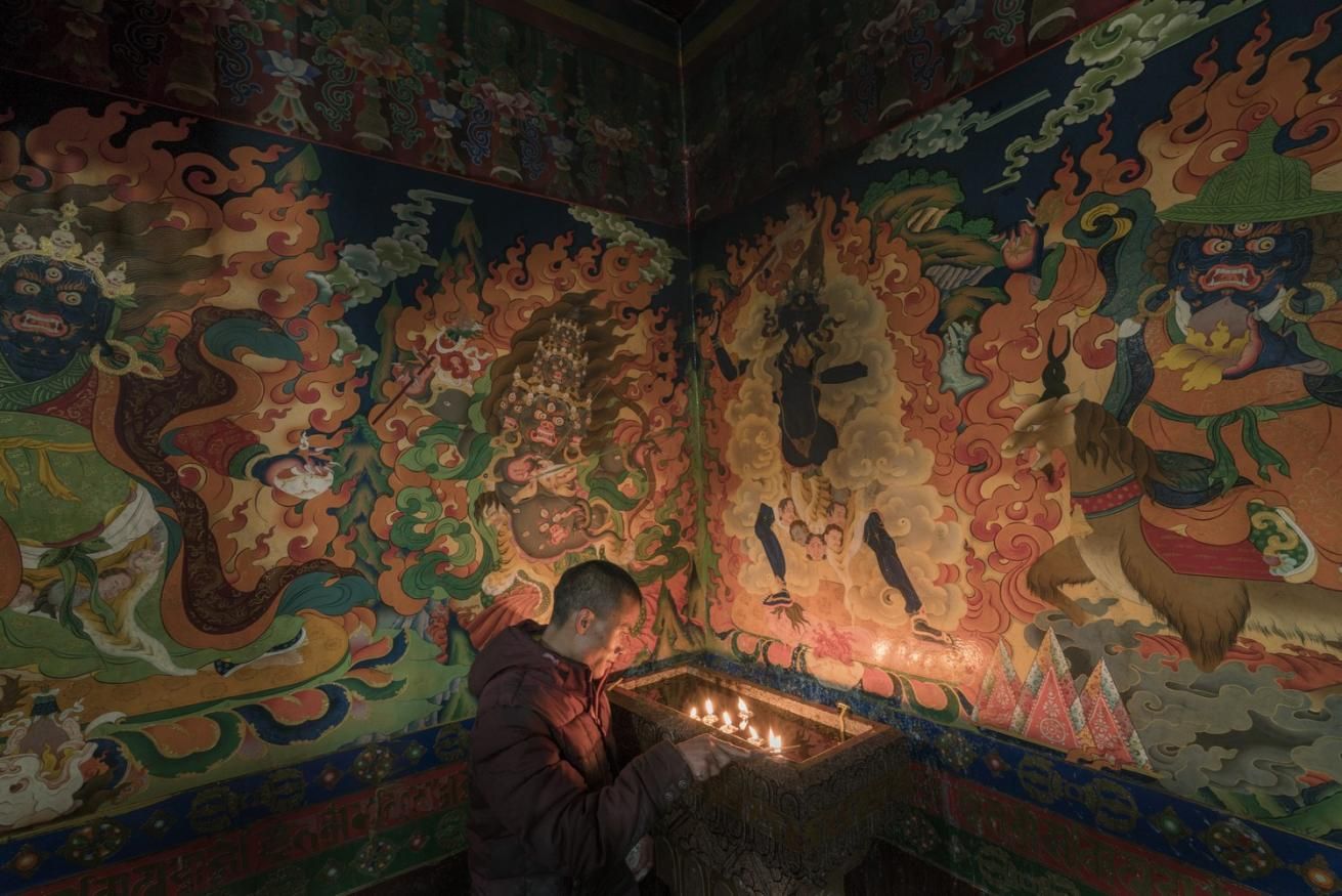 西藏壁畫分布在寺廟、府第、宮殿、民宅、驛站、旅店等地方的墻壁上。而寺院則為壁畫聚集之所,大寺院往往有數十個到數百個殿堂,各個殿堂及其周圍走廊的墻壁、天花板等處均繪滿了壁畫,如果把這些壁畫一幅幅地排列起來,那確實是延綿不斷、絢麗多姿、色彩繽紛的美麗畫廊。