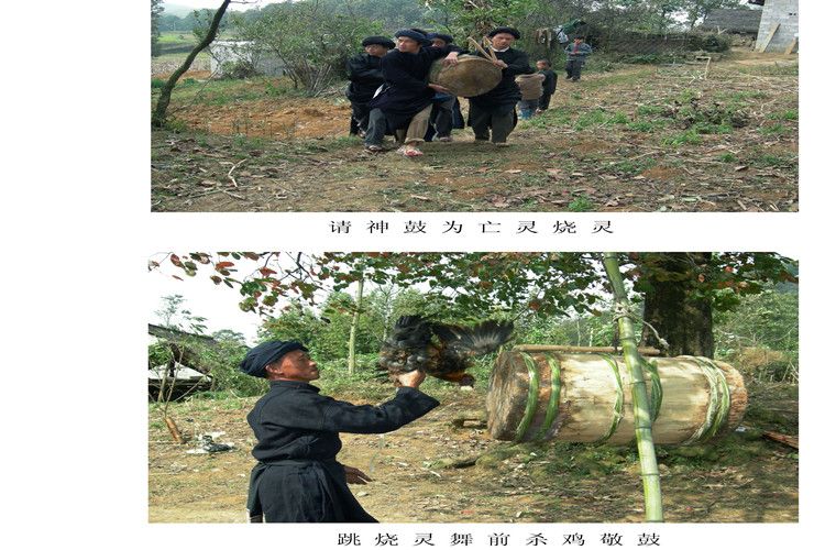 據(jù)苗族民間傳說(shuō),楊魯(指苗族祖先)死后,為祭奠他,苗族人民就用楊魯從玉皇大帝那里帶回來(lái)的木鼓和蘆笙為他做齋,鳴鼓三聲,吹奏蘆笙震天動(dòng)地,接楊魯回來(lái)燒靈,因此鼓和蘆笙成為苗族人民辦喪事的信物,是神靈的象征,以鼓配唱,以鼓配笙吹跳,久而久之形成了苗族祭祀祖先和為亡靈燒靈開(kāi)道的祭祀性舞蹈——“燒靈舞”。遠(yuǎn)古時(shí)期,苗族是比較強(qiáng)大的民族,苗族的喪葬習(xí)俗,一直受著鬼神觀念的影響,并在意識(shí)形態(tài)深處,打下了深刻的烙印。由此可知,苗族“燒靈舞”源遠(yuǎn)流長(zhǎng),以口傳心授方式代代相傳。