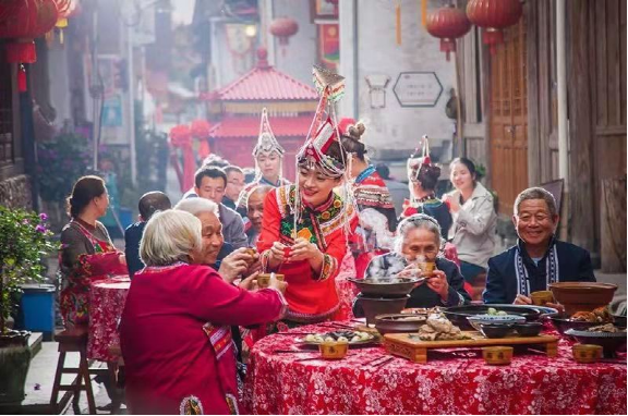 2.畬族婚嫁:婚禮的特色較多。迎親隊(duì)伍到村時(shí),嫁方村上女性拿杉木枝欄路,表示晚上要對歌;到中堂時(shí),嫁方請四位男子與迎親隊(duì)伍中四人相對作揖,此儀式叫“拾田螺”,表示歡迎;中餐由嫁方請迎親隊(duì)伍,媒人就坐中堂席首位,叫“落腳酒”;晚餐由娶方請嫁方親戚朋友,舅公就坐首席,叫請“大酒”;午后,赤郎舉行“借鍋”儀式,赤郎端點(diǎn)紅燭放有一刀肉和兩塊豆腐的米篩向灶神作揖后,用謎語念借所有的炊具,姑嫂們把能藏的炊具都藏起來,念不到就不拿出來,要全部重借,“借鍋”意為娶方借嫁方炊具宴請客人。借好之后,赤郎要?dú)⑷⒎郊姨魜淼囊恢还u用以嫁方“請祖公”,殺雞時(shí),規(guī)定血不許滴到地上,滴一滴地上罰一碗酒;宴席中途嫁方女歌手會起歌頭找赤郎對歌。畬族婚禮的又一個(gè)特點(diǎn)是,新娘夜行嫁,卯時(shí)進(jìn)夫家門。行嫁時(shí)有牛在前頭踏路,意為新娘一切都要新的,牛踏過的路為新路。以往嫁妝有鋤頭、斗笠、棕衣、線簍、火籠等,體現(xiàn)了畬族婦女熱愛勞動。