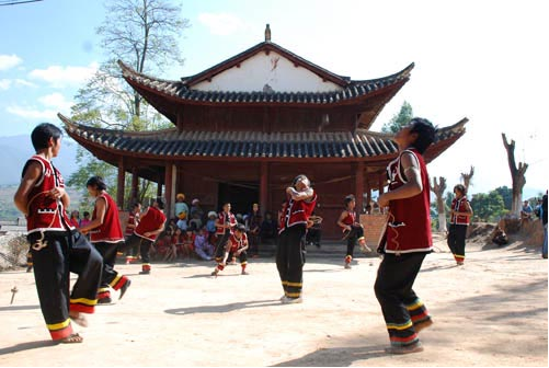 佤族同胞在雙江這片紅土地上長期繁衍生息,積淀了自己獨特的生活和文化習俗。其中最彰顯佤族驃勇個性的就是體育競技“雞棕陀螺”。雞棕陀螺迄今只為雙江佤族所獨有,在全國獨一無二。表演雞棕陀螺極富難度技巧。雞棕陀螺用質地堅硬的紫楊木制作,因其外觀像野生菌雞棕而得名。其表演要領是: