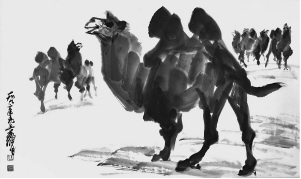 駝隊背負著生活的荷載,承載著最原始的物流,古時候的絲綢之路也是靠駝背馱出來的。浩瀚沙漠,赤地千里,群駝揚起高傲的頭,目光炯炯地對抗西北的烈風。人們贊美駱駝,并不是因為它偉岸雄健的身姿,而是它對惡劣環境那種淡然的態度,似乎它們與上蒼有個剛直的約定,不懼嚴寒酷暑,不懼路途遙遠,敢與沙塵暴面對面抗衡。它們在行走中鑄就生命的品格,天地之間,駝印曲曲折折,一路向前……