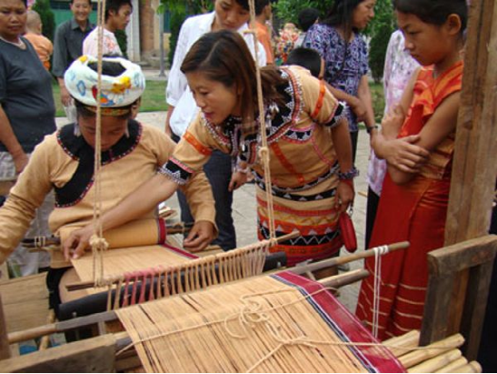2010年上海世博會(huì)活動(dòng)周期間,一臺(tái)名為《記憶云南》的18項(xiàng)非物質(zhì)文化遺產(chǎn)展示成為最吸引眼球的亮點(diǎn)之一。活動(dòng)現(xiàn)場(chǎng),18名云南非物質(zhì)文化遺產(chǎn)傳承人和民間藝人展示白族布扎、納西族東巴畫、傣族剪紙、傣族竹編、佤族織錦技藝等制作技藝。其間展示的佤族織錦技藝在民族文化風(fēng)情濃郁,文化底蘊(yùn)深厚的耿馬縣佤族村寨里流傳甚廣。在耿馬的佤族村寨里,婦女們一般都會(huì)紡線織布,佤族傳統(tǒng)服飾也多用自染自織的土布縫制。此地佤族傳統(tǒng)服飾按地域分為兩大類。一類是分布在耿馬鎮(zhèn)、四排山鄉(xiāng)的傳統(tǒng)服飾,以女性身著佤族紅色短衣筒裙、男子身著佤族黑衣寬褲為標(biāo)志;一類是分布在勐簡(jiǎn)鄉(xiāng)大寨村的“黃衣阿佤”服飾,以女性身著佤族黃衣筒裙、男子身著黃衣寬褲為標(biāo)志。佤族婦女所用的紡線有棉線、麻線兩種。棉主要是草棉,麻主要為苧麻和野生火麻,紡線采用內(nèi)地傳入的有紡錘的紡車。在耿馬鎮(zhèn)芒國(guó)村芒俄村民小組等佤族聚居村寨,筆者先后目睹了佤族織錦的全過(guò)程。只見紡織 中的佤族婦女一個(gè)個(gè)端坐在紡車前,凝神專注地操持著手中的活計(jì)。她們左手持麻,右手持紡錘,將紡錘放在大腿上一搓,紡錘轉(zhuǎn)動(dòng)起來(lái)后,把麻纖維慢慢從左手拉出并捻成線,紡好一截線便將它繞到小竹棍上。如此這般不停地左右穿梭,又不斷地再搓、再捻,紡出的布匹紋理細(xì)密、結(jié)實(shí)挺拔。耿馬四排山鄉(xiāng)織錦的佤族婦女,大多采用一套竹木制的很原始的腰機(jī),前后上下共有十七個(gè)零件。紡線時(shí),她們將線的一頭栓在婦女腰上,另一頭用木棍穿好,擱在織布處釘在地上的兩根木樁上。織時(shí)兩頭繃緊,將繞在木棍上的緯線穿到經(jīng)線的中間,然后用抒刀把線打緊。這種織法節(jié)奏雖然慢一些,但織出的布更加厚實(shí)緊繃,適用于紡織粗布和麻袋。在勐簡(jiǎn)鄉(xiāng)大寨村的穿“黃衣”的佤族婦女,用黃土、玉米粉、茶葉、小飯豆、欖樹皮等7種植物做原料浸染的黃色棉線織錦,使用的有竹木制腰機(jī)和紡錘紡車兩種。織錦時(shí),只見她們一邊捻線,一邊傳遞紡錘。不織時(shí),又把紡錘和抒刀拆下,依然卷起放好。來(lái)自耿馬鎮(zhèn)、四排山鄉(xiāng)、勐簡(jiǎn)鄉(xiāng)的佤族群眾介紹,中華人民共和國(guó)成立后,由于商店里賣的布料比佤族自織的布料更價(jià)廉物美,佤族人家自己紡織制作服飾的已經(jīng)不多,但是縫制麻布被和麻袋用的麻布,還是多數(shù)來(lái)源于自家紡織,尤其是佤族村寨婦女穿的裙子,也必須是自己織,不然會(huì)被人同族人恥笑為愚笨和懶惰。2009年以來(lái),每年5月中旬,耿馬都要舉辦佤族“青苗節(jié)”慶典活動(dòng)。活動(dòng)期間,該縣不僅上演豐富多彩的文藝節(jié)目和民間體育比賽項(xiàng)目,還現(xiàn)場(chǎng)展示該縣獨(dú)具特色的佤族織錦技術(shù)。織錦展示中,來(lái)賓增長(zhǎng)了對(duì)佤族傳統(tǒng)手工技藝方面的知識(shí),不少圍觀群眾還饒有興趣地一邊詢問(wèn)織錦者,一邊親自動(dòng)手體驗(yàn)這項(xiàng)古老而傳統(tǒng)的紡織技藝。
