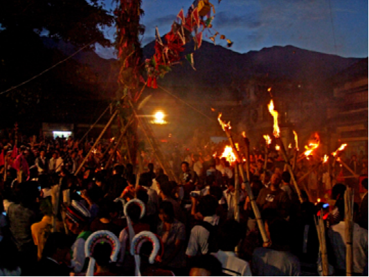 白族視火為生命與靈魂的護佑物,古有火崇拜習(xí)俗,火把節(jié)是白族對“生之禮贊和死之緬懷的節(jié)日”。火把節(jié)這一天,各村由年內(nèi)新添子嗣之家作“會首”,在場壩中豎一高大的火把,常年扎十二臺,潤年扎十三臺,頂端扎升斗旗幟,上書“風(fēng)調(diào)雨順”、“五谷豐登”字樣,下懸花紅、梨子、銅錢等物。天擦黑點燃火把,會首們以糖果、炒蠶豆、煙、茶、酒招待相聚在場壩中的老小。兒童則一手持小火炬,一手往火炬上撥灑松脂粉沐相戲,對新生的嬰兒表示致賀禮贊。與此同日,新亡故者之家人須上墳祭祀,在新故者墳前或大門口豎一小火把,如是者三年,表示對死者的緬懷,與史書“星回日祭祖”的記載相合。