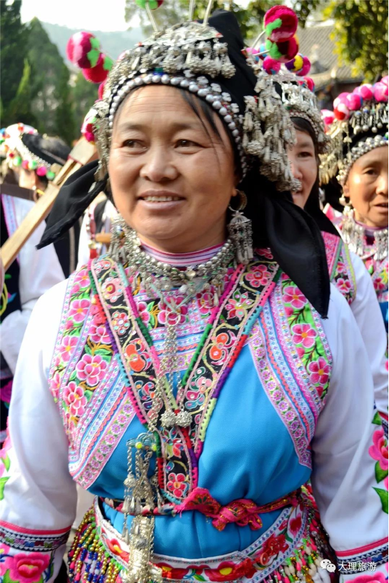 踏歌會上,來自彌渡彝族聚居地的各村各寨男女老幼穿戴整齊,云集在鐵柱廟,這里便形成了五彩斑斕的彝族服飾比賽場,每位彝族婦女的頭飾就是她心靈手巧的見證。