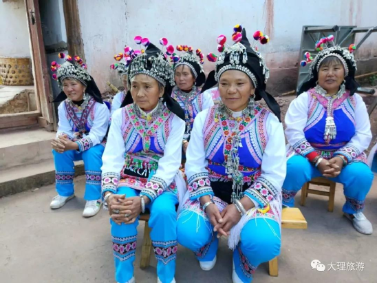 男子頭頂氈帽(又稱氈窩),穿大襟衣、大襠褲,赤足或穿草鞋,披羊皮,外出背皮袋(現已基本消失)。女子裹高包頭、額上飾銀桂花,衣為布襟,外套坎肩,腰系大圍腰,大圍腰左右下三邊繡五色花,為動植物圖案,足穿繡花鳳頭鞋,用本地產綠布條制褲子,不鎖腳邊,腰間背圓形白氈裹背,所穿服飾顏色鮮艷、質地厚重,盡顯遠古南詔皇室服飾遺風。