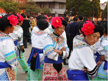 云南巍山彝族回族自治縣各民族如壯麗的織錦,將生活裝扮得五彩繽紛,充滿(mǎn)詩(shī)情畫(huà)意。其中特別是東山一帶的彝族服飾色彩較為豐富,款式變化多姿,并且以大量的銀制品和刺繡裝飾,制作工藝之精良,堪稱(chēng)少數(shù)民族服飾一絕。以小孩帽而言,就有魚(yú)尾帽、小瓢帽、銀鼓帽、花帽和搭耳帽等數(shù)十種,名目繁多,式樣各異。帽子上都繡有花草、樹(shù)葉、龍鳳圖案,鑲嵌著閃亮的銀首飾,十分逗人喜愛(ài)。小孩的衣服式樣也很多,大多由紅、藍(lán)、綠、白幾種顏色的布料縫制而成,紅綠交織,藍(lán)白相襯,非常艷麗。如花朵一般的彝族少女通常頭戴銀鼓帽,墜耳環(huán)、身穿藍(lán)領(lǐng)褂,腰系花圍裙,下著綠彩褲,背掛圓裹背。銀鼓帽和繡花鞋做工極為精巧,全套裝飾花團(tuán)錦簇,恰似一只開(kāi)屏的孔雀。結(jié)婚后的婦女就不再戴帽子,改為結(jié)發(fā)髻,裹包頭。發(fā)髻一般呈寶塔狀,外裹黑紗和黑布包頭,發(fā)髻上戴“別子”。“別子”其實(shí)就是發(fā)卡,均為銀制品,分為四串,每串有兩個(gè)燈籠繡球,兩個(gè)響鈴和兩尾小魚(yú)。包頭巾外再用銀串珠、亮球飾之。上衣著右衽大襟,前短后長(zhǎng)、領(lǐng)、袖及襟邊則鑲以多層不同的金銀絲瓣或自繡花紋的多層寬窄不同的花邊。外罩齊腰藍(lán)布短領(lǐng)褂,領(lǐng)口上安裝著七個(gè)用銀鼓釘湊成五個(gè)葉子,狀如葵花形,彝語(yǔ)叫“披巴”的裝飾。領(lǐng)褂四周皆用銀鼓釘鑲邊,共四排,每排36顆。一件領(lǐng)褂上需有兩百多顆銀鼓釘,加上胸前佩戴銀制的“三須”針筒,“菱角吊”串珠和雞心型繡花荷包,整個(gè)裝飾真是銀裝素裹,分外嬌嬈。腰間系的圍腰布上,鑲嵌多層金銀絲瓣或自繡圖案的花邊。圖案有串枝蓮、牡丹花、太陽(yáng)花及鳳戲牡丹、丹鳳朝陽(yáng)等。無(wú)論未婚和已婚婦女,背上都有一個(gè)用羊毛搟制而成的圓型繡花裹背,直徑約一尺不等,內(nèi)外兩層,中可承物,上繡兩對(duì)太陽(yáng)花,一大一小,對(duì)稱(chēng)排列。裹背除用作裝飾外,還可保護(hù)腰部,既有欣賞價(jià)值,又有實(shí)用價(jià)值,這在巍山彝族服飾中是最為典型的一件飾物。銀鼓帽繡有42朵小花,鑲有96顆銀鼓釘,帽頂插有花一朵或釘有櫻花一束。其帽形如金魚(yú),魚(yú)頭魚(yú)身為帽,魚(yú)尾多岔分為護(hù)頸,亦稱(chēng)為“魚(yú)尾帽”。繡花鞋呈船形或鳳頭形,鞋面繡有40余朵小花,紅色中夾有40余片綠葉。如果是新娘鞋,則用紅色或粉色的軟鍛做鞋面,更為講究。