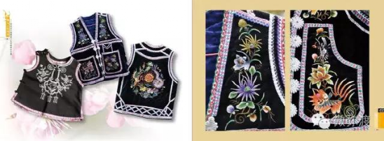 牛街境內(nèi)這兩個(gè)彝族支系的服飾,除頭飾和領(lǐng)合差別較大之外,其它部分由衣服、圍腰、花鞋等組成。襯衣以白色為主,領(lǐng)褂以黑色為主,對(duì)襟鑲邊。圍腰以黑色面料為主,上繡牡丹等大花,兩邊各一花瓶,分長、短兩種。長圍腰訂有兩根掛帶,掛帶有銀質(zhì)掛帶盤,掛帶盤各訂三絲。褲子顏色以深黑色為主。鞋子多為布鞋,鞋底以裱布包白布,以底線密縫,分為三層,中間有毛邊,鞋面黑色繡花,所繡花為喜字、假喜字、撲魚、提籃等花樣。