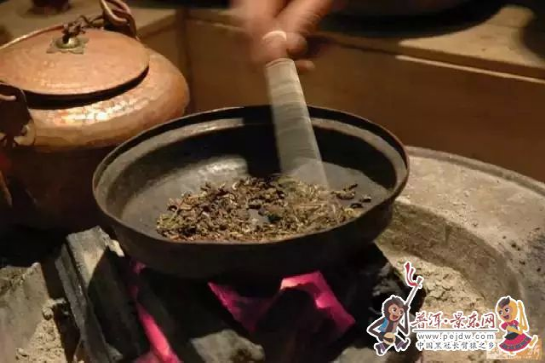 彝家糊米罐罐香茶烤罐要肚大口小,大小適中,茶具為土陶和紫砂制品為主。泡茶取無量山泉水,主要工序是用銅壺將水燒開,先將上好的糯米煎烤至黃,再將取于哀牢無量山的曬青白牙口茶放入抖烤。烤茶時要求“烤關百抖”,茶葉泛香糯米焦黃,糊米和茶葉烤好后,即沖入少量沸水,讓水自動沖除罐口浮沫,放入小片刨開的鮮姜,再加入開水煮一分鐘,即可入杯,奉給客人飲用。