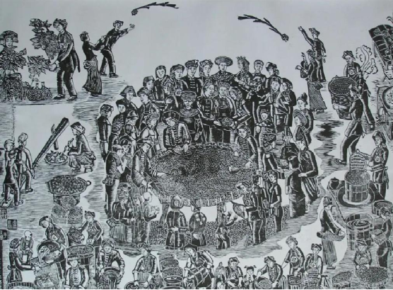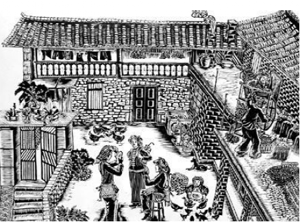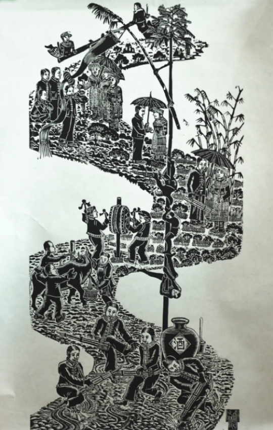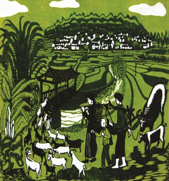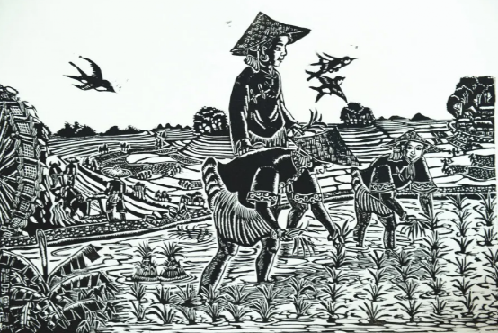 云南馬關壯族農民版畫起源于馬關縣仁和鎮阿峨新寨村,“以刀代筆”是其主要的藝術形式,刀法粗獷、豪放而不乏細膩,具有濃郁的鄉土氣息和深厚的民族文化內涵。