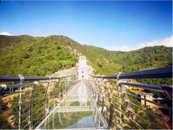 沿著木棧道,一路緩緩而行。滿山遍野的綠撲面而來,自然生長的白樺林,依山而建的鱗次櫛比的小木屋,78米高212米長的玻璃棧道,2萬平方米的水上樂園……人與景相依相融,林胡古塞處處充滿著現代與古樸結合的畫面。