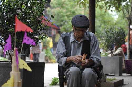 早上十點(diǎn)左右,火把就快扎好了。色彩鮮艷的紙裱斗升上各色卷著的彩旗正一個(gè)個(gè)被打開,梨、蘋果、花紅正被栓成一串串地掛在樹枝上,水泥桌上擺著小旗、炒蠶豆和糖果等,老人們在一旁邊笑邊聊,一盤彩色米干在燦爛的笑著。