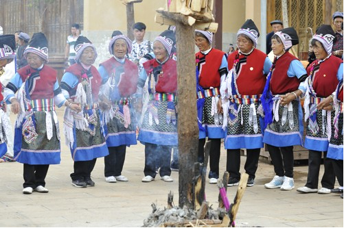 到了這一天,親友鄰居都不請自到來幫忙和祝賀。綁扎柴禾,做小彩旗,栓水果串等,等一切都好,再齊心合力豎起火把。等掛著果串的斗升一點(diǎn)點(diǎn)離開地面,火把樹穩(wěn)穩(wěn)當(dāng)當(dāng)挺立的時(shí)候,孩子的奶奶和外婆就在火把樹下燃起香,敬上茶酒和米干,虔誠地磕頭祈禱。