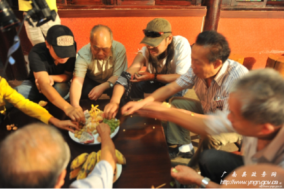西行音樂公路之旅在享用土司盛宴——“三滴水”后,劇組被壯民族創造的具有深厚民族文化貫穿其中的民族飲食文化所折服,被壯民族熱情好客的情緒所感染。西行音樂公路之旅執行導演劉暢說,北京有滿漢全席,想不到在廣南這個地方也有壯族自己的“滿漢全席”,他說,我和我的小朋友們都驚呆了!