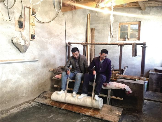 耐心等待過(guò)后,到了大家常說(shuō)的“洗氈”步驟,作為搟氈中最重要的一個(gè)環(huán)節(jié),需兩人坐在木凳上,利用手中的帶子,兩人同步,反復(fù)蹬拉100多次,灑上大量熱水,直到把羊毛上的油脂等污物洗干凈,之后經(jīng)過(guò)搓氈邊、曬氈,最終交付到顧客手里,一塊羊毛氈就算順利地完成了。