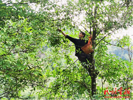 羅運村村民在樹上采摘八角。