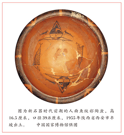 在中國國家博物館的展廳中,既有陜西半坡出土的人面魚紋彩陶盆、陜西華州區出土的鷹形陶鼎、河南賈湖出土的七孔骨笛、內蒙古翁牛特旗出土的紅山玉龍、甘肅出土的馬家窯文化渦紋四系彩陶罐,也有山西襄汾陶寺出土的陶壺、浙江良渚出土的雙鼻陶壺、四川廣漢三星堆出土的青銅面具……