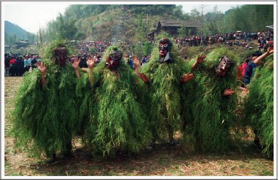 每年十七坡,當村村寨寨的蘆笙隊進場了,四面八方的客人都趕來了,這時,芒篙們就大搖大擺地從山溝溝里走出來,它們在山腳上匯合,排列成行,仰望著太陽,集體叩拜,祈求新年風調雨順;它們經過田園的時候,整整田坎,看看田水,并齊聲喊“哎——呀”,表示新年豐收在望;它們走進每村每寨,所到之處,人們開鐵槍、放鞭炮、敲鑼打鼓,歡迎芒篙的到來,以此表示吉祥如意;它們進入蘆笙坪,看見小孩,停下來親切地撫摸,祝福快長快大;看見老人,親切地擁護,祝福老人健康長壽;看見美麗少女,圍著跳舞,以此表示歡迎和祝福。最后,它們沖進蘆笙堂,與姑娘、小伙一起跳蘆笙舞,直到蘆笙坡會結束,它們才依依不舍地離開。
