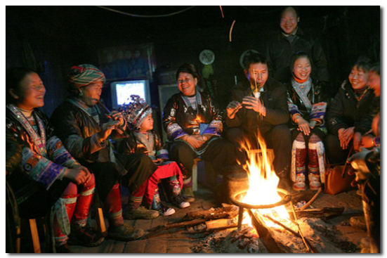 苗族起木樓很注重火塘的設置,特別留出二樓正中的大半廂作火塘。火塘用寬厚老杉木板鑲制成一個長寬約一點五米,深約六十公分的正方形木槽,槽內用粘性強的黃泥巴填滿舂緊,正中央安放有三腳鐵架,用于架鍋煮食。火塘是煮食、進餐、取暖、會客、議事、祭祀的地方,又是年輕人走妹行歌、談情說愛、舉行婚禮儀式的場所。因此苗家人對火塘是十分看重的。