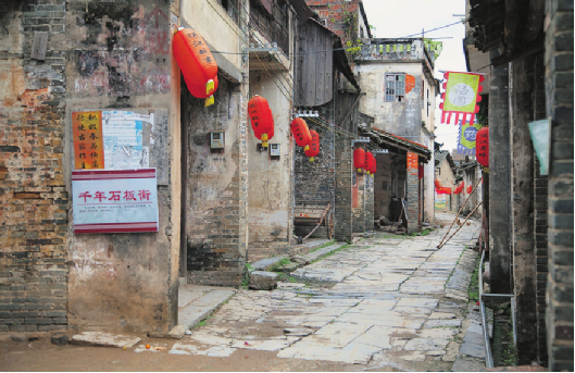 千年老街自北向南,寬約4米、長(zhǎng)約300米,青石板路面。沿街多為典型的嶺南風(fēng)格建筑,二層騎樓,房屋寬敞深長(zhǎng),一樓為鋪,二樓為居,前為店,后為廚。天井頂面多設(shè)明瓦數(shù)塊,以取日光照射,木梯扶手、門窗雕刻的粗細(xì)花紋無(wú)聲地證明它們?cè)?jīng)的風(fēng)采。看得出當(dāng)年舊街果然是繁華過(guò)的,有飯館,有劇院,有酒肆,有客棧,有百貨,街道排水、布局都很合理,有的街道至今在門前仍有留有水道。