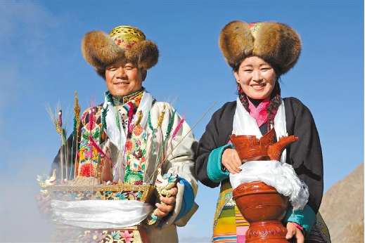 曲水縣協榮村春耕儀式上,身著盛裝的村民端著切瑪和青稞酒。
