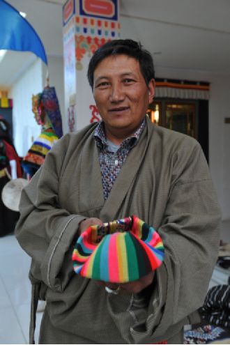 在自治區群藝館的展出現場,除卻這些光鮮亮麗的民族服裝之外,另一個特殊群體也同樣吸引了眾人的目光,他們便是從西藏各個地區前來為觀眾展示藏裝制作工藝的民間手工藝人。他們有的在織布,有的在裁剪,有的在穿針引線做靴子、縫制衣服,這些數以萬計的、平凡而又偉大的民間手工藝人們,用他們幾十年如一日的堅守,默默地承擔著民族文化創新與傳承的歷史使命。