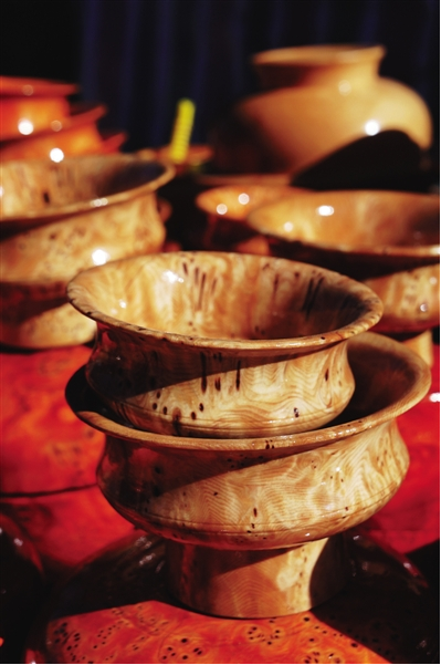 官員們使用的木碗,固然也非常注重外面的金銀寶石包裹,而木碗本身,也有一套非常固定的學問,盛開水不裂,摔到地上不會破,不燙手不冰手,體輕而質固,經久耐用,可以爺孫相傳。用這種碗盛食,可以完全保持食物原味,吃酥油糌粑等油肉類食品猶為適宜。比之于一般瓷碗,是碗中上品。這種木碗一般都是選用一些稀有雜木的節或者根雕琢而成,除了材料本身,在加工過程中的工序也十分重要,必須要加工出來一些獨特的花紋,比如磷火紋,或豬鬃紋,或貓頭鷹眼紋等,有這種花紋的碗,就要格外名貴,比如這次普布次仁兄弟所制作的大型核桃木碗,全身均勻地布滿了貓頭鷹眼紋,所以才能賣出這么高的價格。在西藏很多地區,都流傳著這樣一個諺語:“一只上等木碗等于10頭牦牛。”