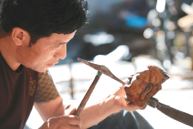 20歲前的次嘎已可以承接一些佛像的鍛敲任務(wù),掌握的技術(shù)遠(yuǎn)遠(yuǎn)超出一起學(xué)習(xí)的其他學(xué)徒們。從鍛敲佛像的蓮花底座、焊接,再到鍛敲銅佛造像上半身、下半身,再到慢慢地開(kāi)始做些佛像飾物。偶爾,次嘎也能涉獵造像的臉部。這是一個(gè)造像師手藝達(dá)到最好時(shí)才可以觸及的部位。“面部結(jié)構(gòu)復(fù)雜又微妙,面部表情的刻畫(huà)更是難上加難。作為一個(gè)造像師,這是最考驗(yàn)功力的地方,每一次敲打都在決定作品的成敗。”次嘎說(shuō)道。