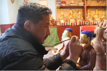 據普布次仁介紹,這些制作精美的手工藝品都出自邊巴之手,今年43歲的邊巴已經有20多年的制作經驗,應該可以算是泥塑手工技藝里的佼佼者。當向邊巴說明來意后,這個藏族漢子反而顯得有些靦腆,邊巴說:“我從小就對傳統手工藝很感興趣,家人就專門找了師父讓我去學習,剛開始就學一些彩繪技巧,包括如何上色、構圖等,后來接觸到了泥塑技藝,我就逐漸迷上了它,這一晃20多年過去了。”