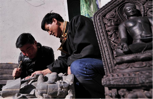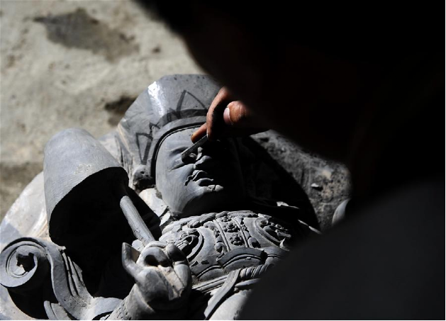 伴隨著收音機傳出的旋律,西藏自治區級黑玉石雕刻技藝非物質文化遺產傳承人土登加措和他的徒弟們開始了又一天的黑玉石佛像雕刻工作。黑玉石產生于海拔4500米以上的石山上,是高原特有的一種石材。據古書記載,西藏第一代藏王聶赤贊普曾將天降的經書、塔模等佛教圣物封存于洞中,并以黑玉石雕刻佛塔做蓋,于是便有了西藏歷史上有記載的第一件黑玉石雕刻作品。作為這門技藝的第五代傳人,土登加措延續著家族的技藝,一直傳承著這門古老的技藝。西藏黑玉石雕刻技藝在2012年入選第四批西藏自治區級非物質文化遺產名錄,土登加措如今已有近30名弟子,古老的黑玉石雕刻技藝正在慢慢走向世界。新華社記者 晉美多吉 攝