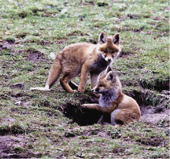 藍天白云,微風輕漾;草地碧綠,鳥語花香。大自然的美景圖正在小赤狐的家園四周徐徐展開。在膽大的小赤狐的叫喚聲里,躲在洞內的另外兩只小赤狐也壯著膽子探出頭來。不一會兒,它們習慣了周圍的環境,三只小赤狐在離洞口5米遠的范圍內嬉戲玩耍著。它們時而跳躍,時而奔跑,展現出本能的捕獵動作。稍大一點的小赤狐騎在小一點赤狐的背上嬉戲玩耍,小赤狐也不示弱,奮力反擊,猶如兒童打鬧,其樂無窮。那烏黑溜圓的眼睛彎了又彎,毛茸茸的尾巴高高地翹起,身體嬌小,惹人喜愛,讓人看了會產生想上去抱一抱、摸一摸小赤狐身軀的念頭。