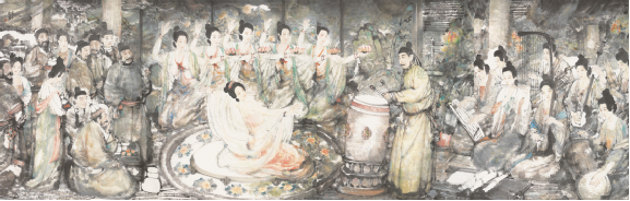 劍器舞也有著悠久傳統,早在春秋戰國時代,孔子的學生子路,戎裝見孔子,曾拔劍起舞。學生拜見老師舞劍,當然只是表演技藝,是對老師致敬的意思。湖北隨縣戰國初期曾侯乙墓出土的鴛鴦盒上的樂舞圖案中,鼓旁的舞者腰間掛著短劍,說明劍舞可能是當時頗為流行的一種舞蹈形式。楚漢相爭時,劉邦、項羽宴于鴻門,項莊說:“君王與沛公飲,軍中無以為樂,請以劍舞。”項羽表示同意,于是項莊拔劍起舞,逐漸靠近劉邦,企圖借機殺死劉邦,在場的項伯見劉邦危急,也以劍伴舞,保護劉邦不被項莊殺害。這個故事表明,當時筵宴中有舞劍作為助興表演的風俗。唐代,杜甫作《故武衛將軍挽歌三首》,有“舞劍過人絕”句。可見當時許多人會舞劍,而且各有絕招。公孫大娘最為擅長的《劍器舞》,是《裴將軍滿堂勢》。杜甫曾觀其舞,并寫了《觀公孫大娘弟子舞劍器行》一詩,觀者如山,可見此舞技巧之高。