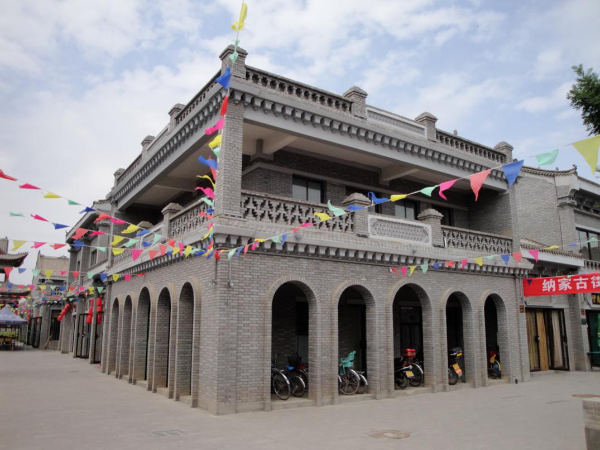 中華回鄉第一街位于永寧縣納家戶北側。該項目以納家戶清真大寺為中心擴展門前廣場,以廣場為中心向北,直北長380米,東西寬107米,占地面積93.78畝,建筑面積1.6萬平方米,建成商鋪177套。所有建筑遵循當地回族的建筑風格,采用青磚砌筑,尤其在細節處理上用符號、色調與裝飾來表現回族建筑的精髓。雕梁畫棟,飛檐四出,并且在墻壁、牌坊、檐口、山墻等處運用了大量磚雕、伊斯蘭花飾等將伊斯蘭文化藝術與中國傳統建筑風格有機的結合在一起,為景區增加了濃郁的歷史文化氛圍。該街道由北向南依次分為土特產區、民俗文化區、旅游紀念區、餐飲區、配套商業區五大功能區。