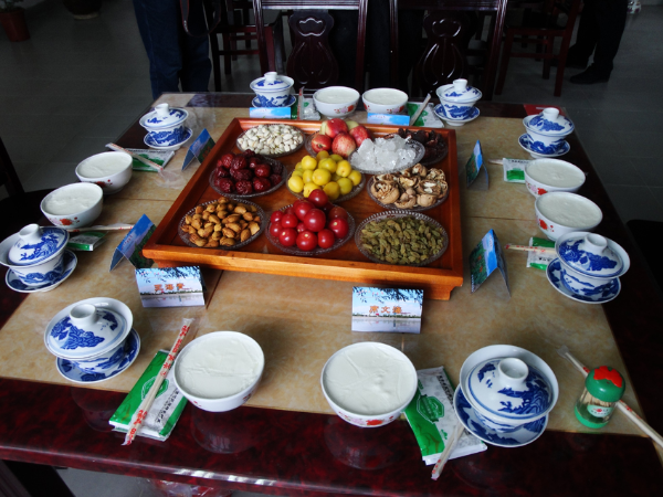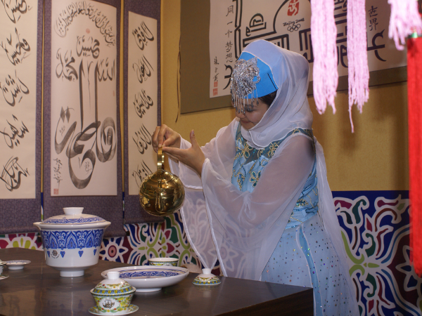 回族普遍喜歡飲茶。回族先民喜食甜品,在中國茶文化影響下,形成了以甜味為特色的飲茶習慣。飲茶之風興起于中國晉代,盛于唐代以后,隨之出現了茶具,其中以包括茶托、茶碗、碗蓋的“三坯胎”蓋碗美觀實用。回族繼承發展了這種茶文化,形成了以“三炮臺”為茶具的“八寶蓋碗茶”:在茶具中放入茶葉(茉莉花茶、陜青茶、紅磚茶、窩窩茶、毛尖等)、糖(白糖、紅糖、冰糖、梨膏糖等)及紅棗、核桃仁、桂圓肉、芝麻、葡萄干、枸杞(或柿餅、山楂、姜片、果干)等配料,用開水沖制后飲用。茶葉及配料在不同的地區、不同的季節,根據飲茶者的身體狀況與喜好有不同的搭配,如“紅糖磚茶”“冰糖陜青茶”“三香茶”(茶葉、糖、桂圓)、“白四品”(陜青茶、白糖、柿餅、紅棗)、“紅四品”(磚茶、紅糖、紅棗、果干)、“五味茶”(綠茶、山楂、芝麻、姜片)等。八寶茶具有生津解渴、開胃健脾的作用,放入不同的茶料,又具備了不同的健身康體功能。