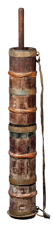 酥油茶是藏族最普遍的飲料。一日三餐、接人待客,都離不開酥油茶。酥油茶的制作各地不盡相同,西藏人打酥油茶時,先將磚茶熬成茶水濾掉茶葉,在特制的酥油桶內放適量的酥油、鹽和開水,再將茶水倒入酥油桶內,然后用特制的木棒上下攪拌,直到茶水和酥油完全相溶即可。而甘青一帶藏族是先將茶盛在碗里,然后加酥油,喝時一邊吹碗邊的油,一邊喝,添數次茶水后,酥油也喝完了(圖為打酥油茶桶)。