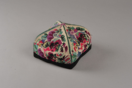 “曼甫朵帕”此款花帽是由手工刺繡成的,四瓣以帽頂為中心拼接縫合,套模成型,以黑絨鑲邊,四棱可折疊。每一瓣三角形內以一個或兩個單獨紋樣,一條邊緣紋樣構成一組適合紋樣,這種紋樣簡練、構圖嚴謹的花帽圖案稱為單獨適合紋樣花帽,維吾爾語稱“曼甫朵帕”。此花帽紋樣大都是以新疆花卉、果實等自然形態為素材,加以藝術的提煉、概括、夸張、變化而使之成為具有濃郁鄉土氣息和強烈民族情趣,圖案有花卉、果實,造型有石榴花、桃花、杏花、麥穗,還有星月、雪花等。此外還大量運用了富有變化的幾何圖案。布底為一色平線,圖案則用優質彩色絲線混合棉線刺繡而成,形成底色和花色對比強烈,艷麗奪目。