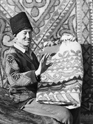 這時,亞生已經(jīng)開始了第二步,他把彈好的羊毛鋪勻,開始噴灑開水。只見他熟練地把水噴向羊毛,然后和妻子一起快速把簾子卷好,用羊毛繩綁緊,再用腳踏著卷好的簾子在平地上來回踏蹬,這樣不停地重復(fù)后,做成了氈坯。亞生停下來解開簾子,拉平氈坯,修整好邊角,又灑上熱開水,把氈坯卷起,這是工藝最關(guān)鍵也是最后一步——他們一起跪在簾上,用雙臂反復(fù)搓滾氈坯,感覺已經(jīng)平整了,夫婦倆又齊心協(xié)力把氈坯展開拉平,放到院子里。此時,亞生長出了一口氣,抹抹頭上的汗說:“晾干了就可以賣了!”