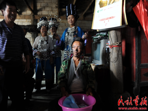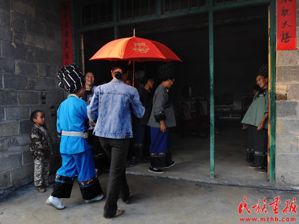 姑娘出嫁必須有娘家人陪送,婚禮這一天清早,“新娘”便在“接親客”的帶領(lǐng)和送親隊(duì)伍的陪同下,一路歡聲笑語 ,浩浩蕩蕩向“新郎”家走來。走到新郎家村邊,有的燃放鞭炮,一直燃放到新郎家門口,請(qǐng)新郎父母出來開門;無鞭炮準(zhǔn)備的,則在寨邊稍候,由迎親伙伴飛報(bào)新郎家做好迎親的準(zhǔn)備。男方父母聽到后,多數(shù)是很高興地喊醒家中兒女,由新郎的妹妹或堂姐妹為迎親主體,加上寨上的姐妹和房族組成迎親隊(duì)伍,打開大門,把新娘迎進(jìn)家來。接親的主要儀式是接傘。接傘的人必須是新郎的小妹或堂妹。無親妹、堂妹者則由新郎父母指定一與新郎同輩份的小姑娘去接。新娘走至大門,即由新郎的妹妹跨出門外迎接新嫂子,新嫂子接著用左手把雨傘遞給接傘的妹妹,接傘妹妹接過新嫂子手中的雨傘后,新娘即用左腳跨進(jìn)屋內(nèi),以示今后成為新家庭的主婦。隨即由接傘妹妹攜新娘手迎入新房,迎親婦女們陸續(xù)進(jìn)入新房休息。入門后,新郎家的“陪娘”及姑娘們便熱情地安排“送親客”團(tuán)團(tuán)圍坐,并簇?fù)碇靶履铩本o靠堂屋中柱子就坐,意為“新娘”從此當(dāng)家立業(yè),將來就像中柱子一樣,頂大梁,撐起這個(gè)家。