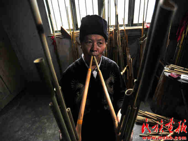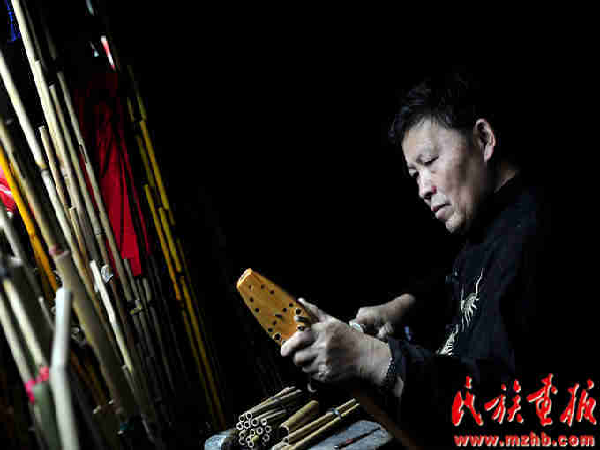 莫師傅在對兩個蘆笙進行高低音的和諧調試